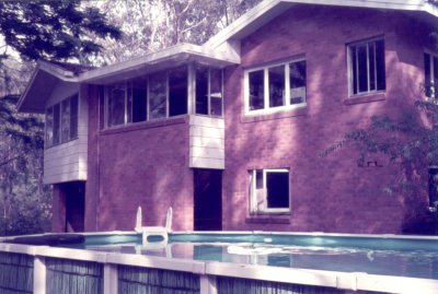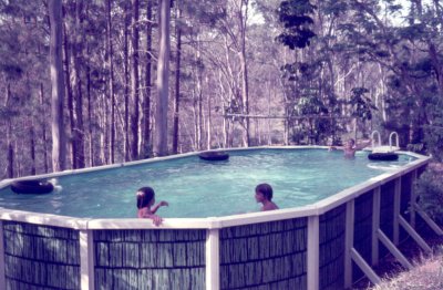 The above ground pool at the back of the house was quite large and surrounded by trees. Joachim and Paul Sawkins are using it. |