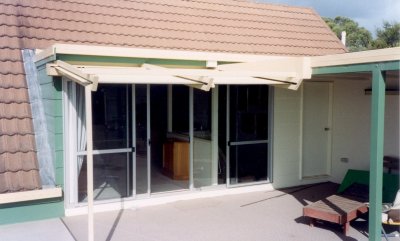 The sliding doors leading to the deck before the solar panels were put on the flat roof. The flat roof on the right had a pipe on it to heat the shower on the deck. |