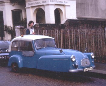 I think this photo was actually taken outside Ray and Hilda Gunston's flat in Putney but is here because this was Roger and Justine Sawkins' first car - it had a motorbike engine and the reverse gear was a lever which attached to the rear wheel. It was very maneuverable but not very powerful. |